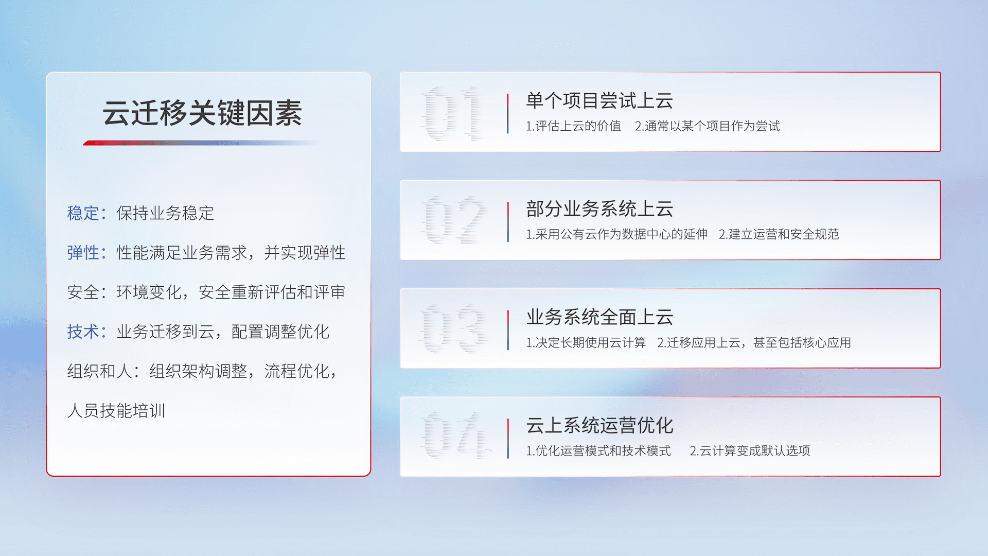 结合实际业务,,从规划设计、、、云平台选型、、云原生改造、、、数据迁移、、、集成交付,,,,迁移全过程为客户识别最佳上云路径,,,做好风险识别管理,,,,设计网络架构、、、、身份权限、、安全审计合规、、操作审计、、、、日志审计、、监控告警策略、、、多站点容灾设计等,,对云上基础设施进行整体规划,,,提升IT治理水平,,,以满足弹性、、高可用、、高性能的需求。。